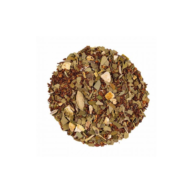 Rooibos, maté vert, écorces d‘orange, morceaux de gingembre, réglisse, fenouil, arôme naturel, cardamome entière.